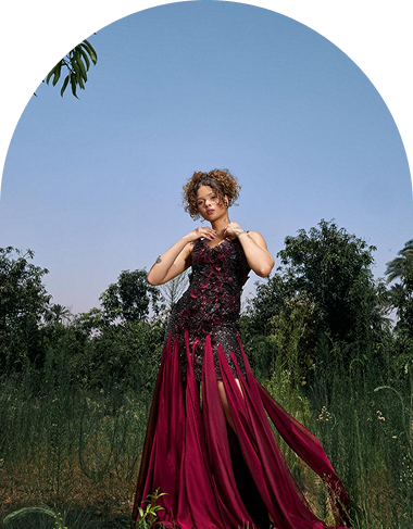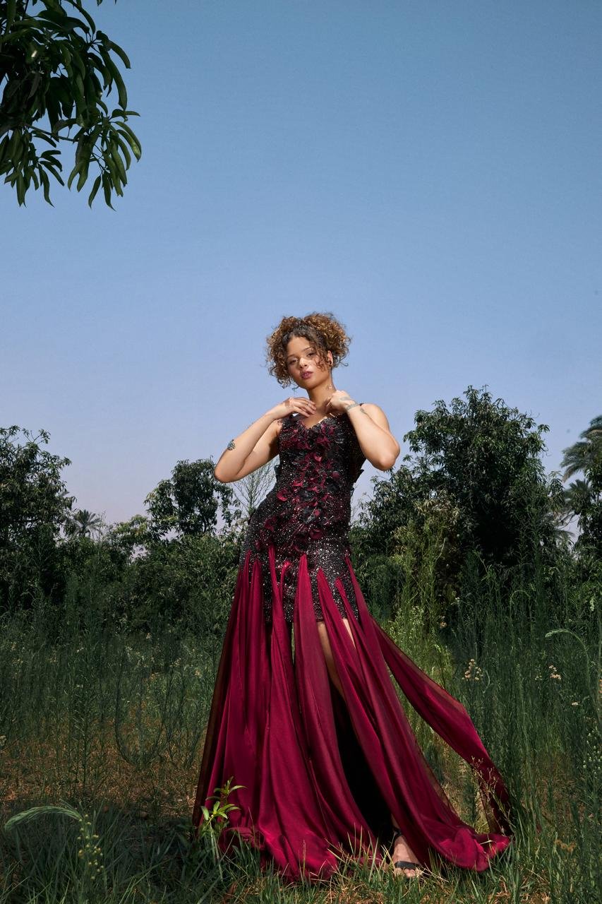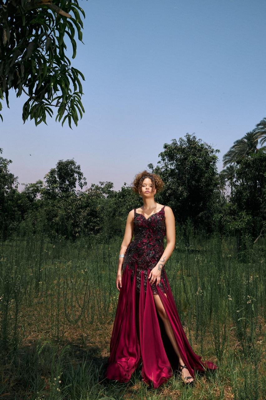 burgundy silk cascades like shadowed vines at dusk. A dress that